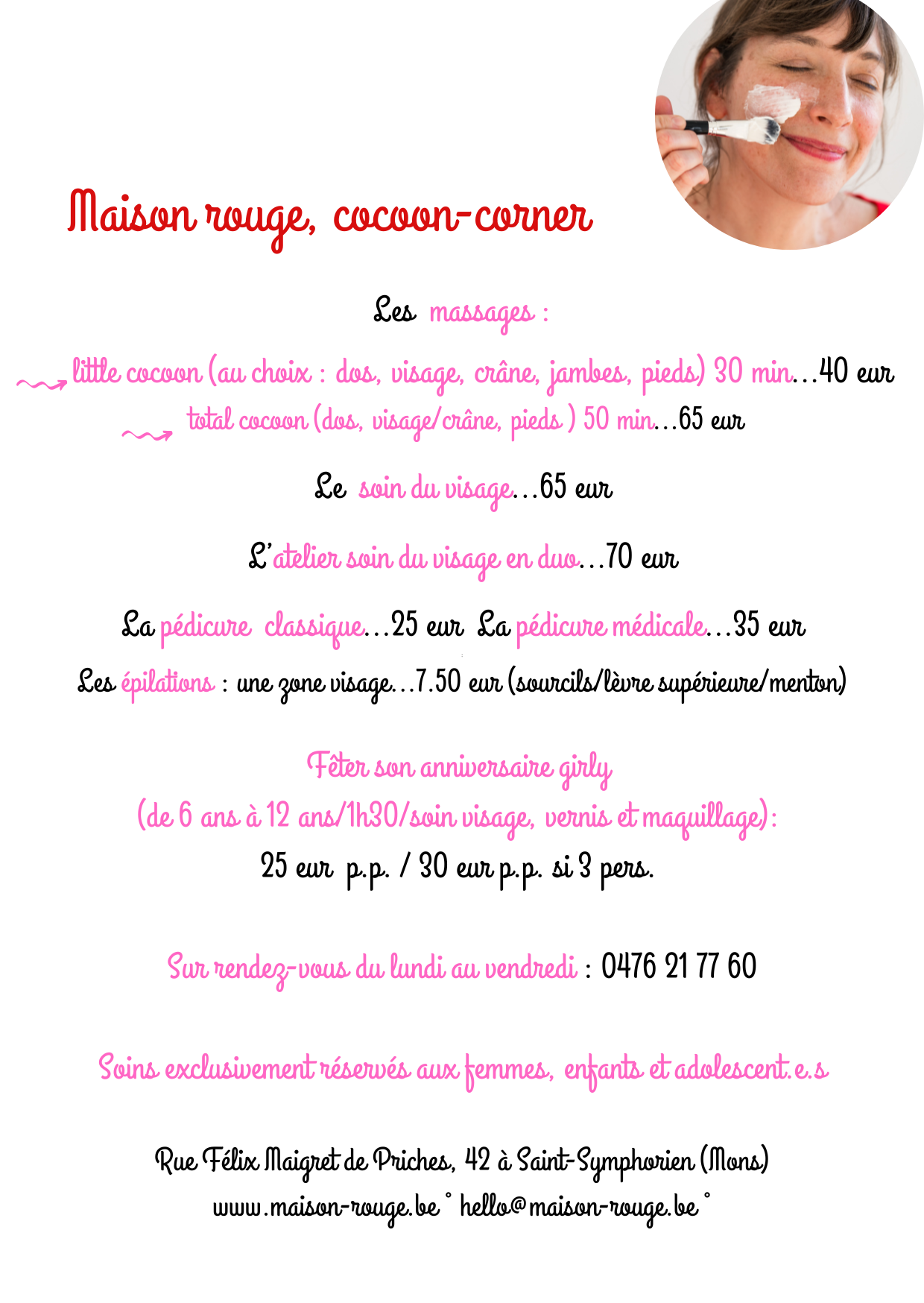 -Elle pourra prendre rdv directement en ligne sur https://www.maison-rouge.be/reserver-un-soin/ ou 0476 21 77 60